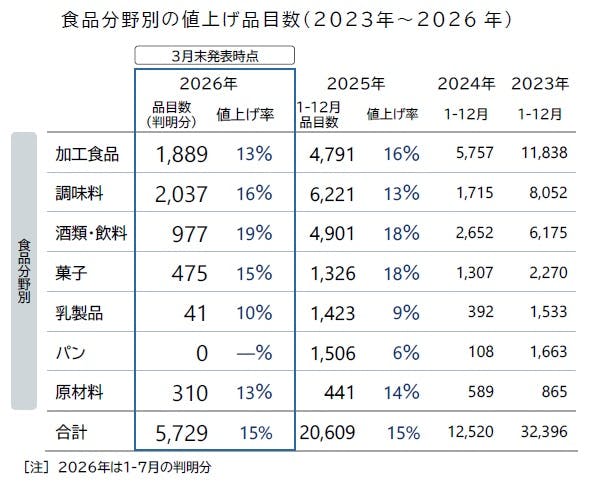 2026年の値上げは、1~7月までの累計で5729品目となり、年間の平均値上げ率は15%に達した。年間の値上げ品目予定が1万品目を超えていた前年同時期(2025年3月31日時点、1万1707品目)に比べ、2026年3月31日時点では予定を含めて前年比5割減ペースでの推移となった。ただ、菓子類などで「減量値上げ」が散見されるほか、コメをはじめ原材料高の影響で価格を引き上げるケースが多かった。さらに米国とイスラエルによるイランへの攻撃で中東地域の地政学的リスクが高まっているほか、原油供給の不安定化による包装資材やエネルギー高への警戒感もここにきて高まっており、鈍化傾向にあった値上げの動きが、年後半に再び強まる可能性がある。