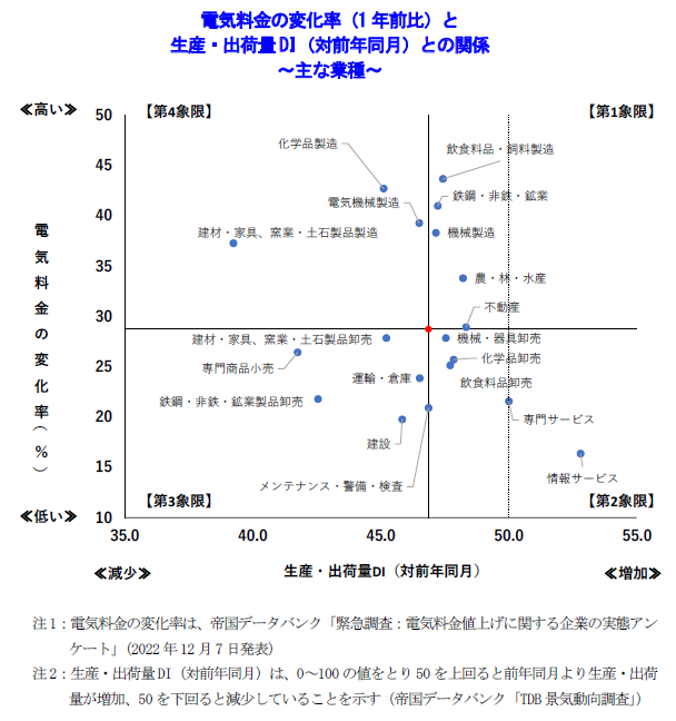 • 電気料金の平均変化率は28.7%、生産・出荷量DIは46.9。左下図の第4象限に位置する「化学品製造」などでは、生産量が増えていないなか電気料金が大きく上昇。コスト負担の高まりが顕著に