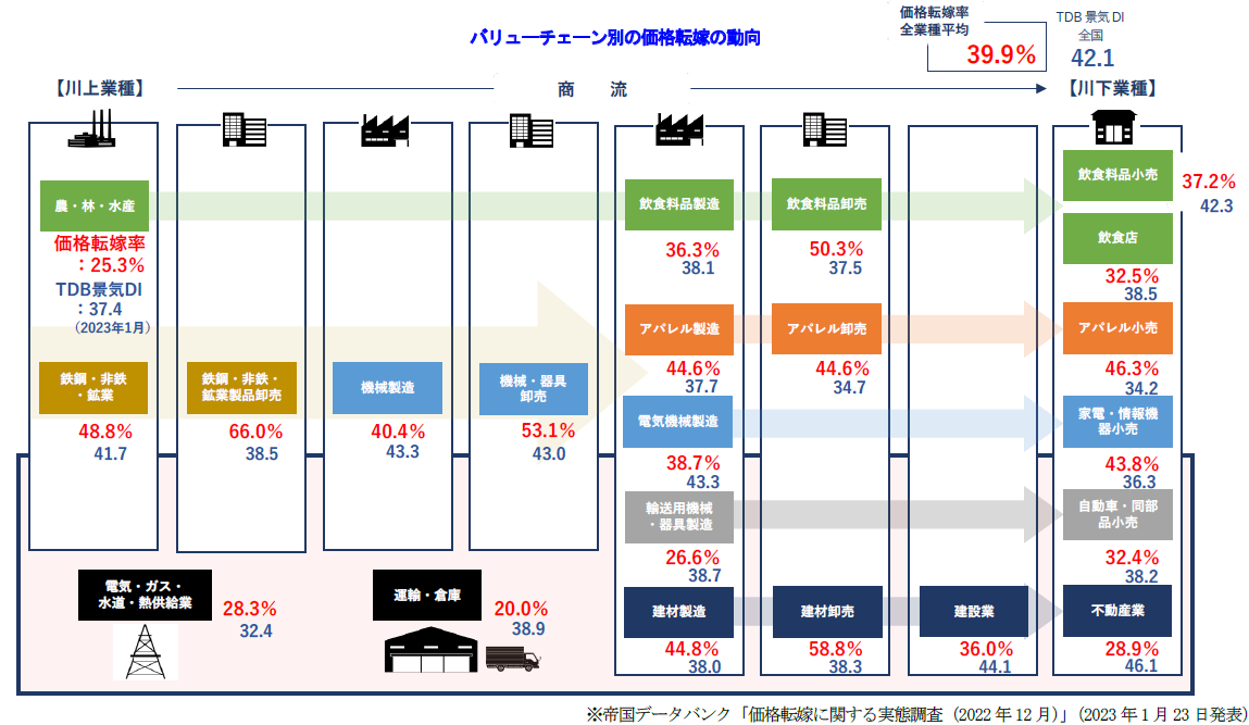 • 価格転嫁率は全体で39.9%、バリューチェーン別では『卸売』の転嫁状況と比較すると『製造』や『小売』関連は苦戦がみられる