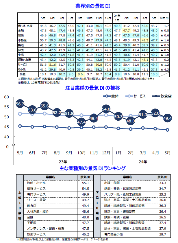 2024年5月の景気DIは前月比0.6ポイント減の43.5となり、2カ月連続で悪化した。国内景気は、個人消費が低迷したことに加えて、原材料価格の高止まりなどコスト負担の増加もあり、2カ月連続で後退した。