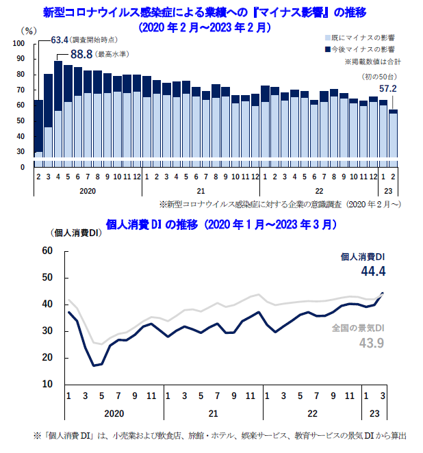 • 新型コロナによる業績へのマイナス影響は3年間で大幅に低下。個人消費関連も改善傾向が続き、当月の個人景気DIは全国の景気DIを上回った
