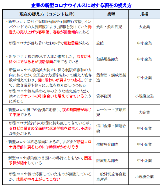 • 新型コロナに対して、既に過ぎた出来事と捉えている企業も少なくない。ただし、依然として影響が続く企業・業界も