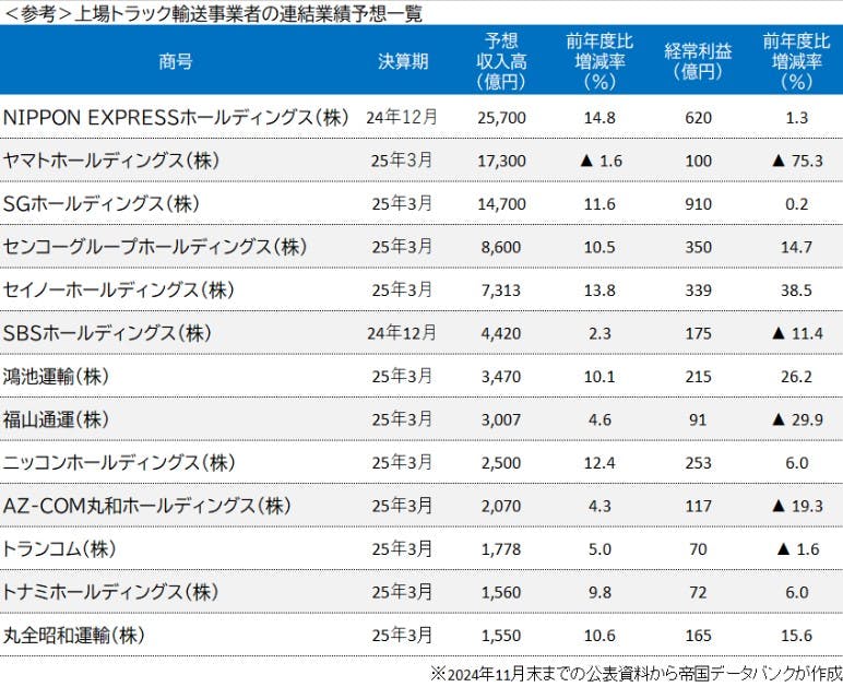 <参考>上場トラック輸送事業者の連結業績予想一覧