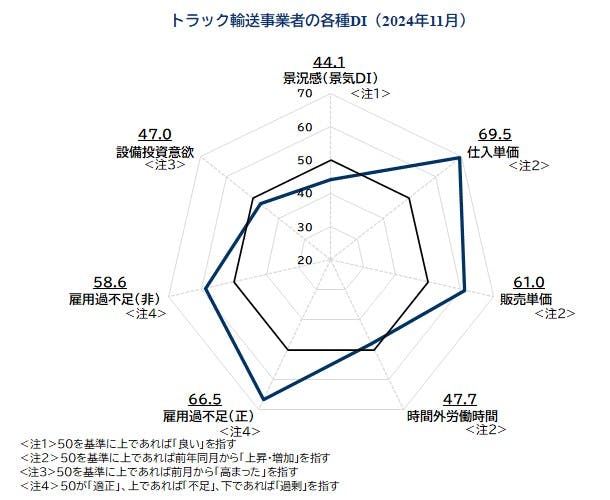 TDB景気動向調査で毎月算出している景況感をはじめとする各種DI[2]をみると、2024年11月時点のトラック輸送[3]事業者の景況感を示す景気DIは44.1と全産業の景気DI(44.4)を0.3ポイント下回り、「良い」「悪い」の判断の境目となる50を5ポイント以上、下回る水準だった 。