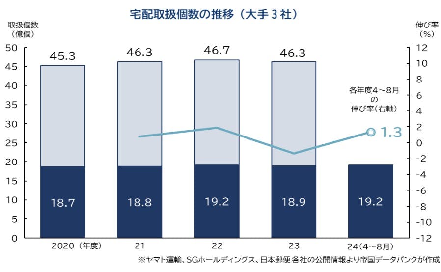 輸送量の動向をみると、貨物営業用自動車[5]の輸送量は、2024年4~8月で計10.5億トン。前年同期(計10.3億トン)と比較すると2.0%増加しており、過去5年間で高い水準を維持していた。また、大手3社の宅配貨物の取り扱い個数[6]においても同様の傾向が表れ、2024年4~8月は計19.2億個で前年同期比1.3%増だった。