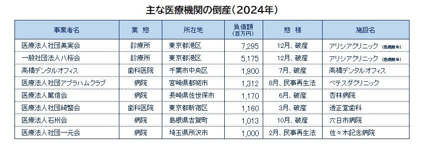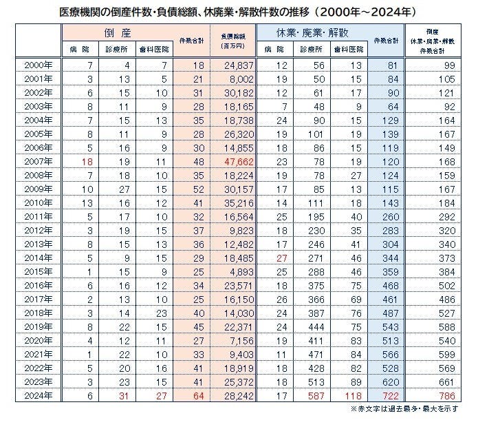 2024年の医療機関(病院、診療所、歯科医院)の倒産は64件、休廃業・解散は722件となり、それぞれ過去最多を更新した。倒産、休廃業・解散ともに「診療所」と「歯科医院」が急増し過去最多となったことで全体を押し上げた。特に経営者の高齢化に伴う「診療所」の休廃業・解散の増加が目立っている。負債額最大の倒産は「アリシアクリニック」を展開していた医療法人美実会(負債72億9500万円)。