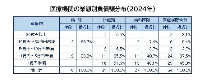 負債額別では、「1億円未満」が29件(構成比45.3%)で最も多く、その他は「1億円~5億円未満」(24件、同37.5%)、「5億円~10億円未満」(3件、同4.7%)、「10億円~30億円未満」(6件、同9.4%)、「30億円以上」(2件、同3.1%)となった。業態別では「病院」が52億3000万円(平均負債額8億7100万円)、「診療所」が166億9400万円(同5億3800万円)、「歯科医院」が63億1800万円(同2億3400万円)となり、3業態の平均(医療機関の平均)は4億4100万円となった。
