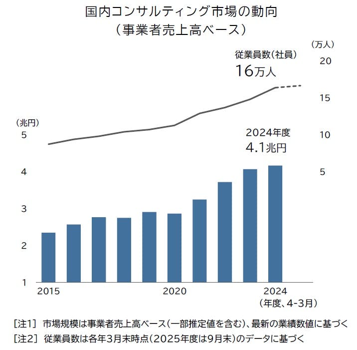 経営コンサルでは、コロナ禍前後にかけて業務プロセスの見直しや自動化ツール・ERPパッケージの導入といったDXの推進からリモートワーク体制の構築など、「まずはIT」の需要が中小企業を中心に急拡大したことで、多くの経営コンサルで特需が発生した。国内の経営コンサルティング市場(事業者売上高ベース)では2021年度以降に前年度比1割前後の成長を続け、2023年度には初めて4兆円を突破したほか、社員数も16万人を超えた。