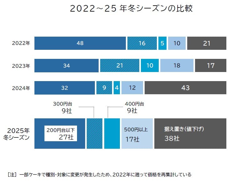 2025年冬シーズンの値上げ幅は昨シーズン(149円・3.4%増)に比べ拡大した。また、本格的な値上げラッシュが始まる前の2021年冬シーズンに比べると約2割高・900円にせまる値上がりとなった。