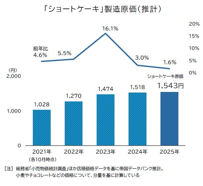 一般的なショートケーキ(ホール)にかかる原材料コストについて、店頭価格を基準に帝国データバンクが「ケーキ原価」として算出した結果、2025年10月時点の平均はショートケーキで1543円となり、前年同月(1518円)に比べて原材料分だけで1.6%・25円の値上がりとなった。原価の上昇幅は今シーズンのクリスマスケーキ価格の値上げ幅(+179円・+3.9%)より低いものの、人件費や光熱費などの製造コスト分を含めると、クリスマスケーキの利幅は年々減少しているとみられる。原材料の高騰を受け、イチゴの代わりにジュレペーストを使用したり、クリームを代用することで価格の据え置きを目指すほか、原価がより安価なタルト類のメニューを新たに増やす等の対策もみられ、消費者の財布が緩むことを期待した「大幅値上げ」が多かった2022~23年冬シーズンと異なり、例年以上に消費者を意識した値付けが目立った。