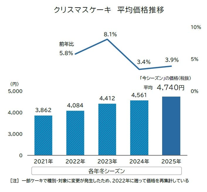 全国の大手コンビニエンスストアや百貨店、スーパー、著名な洋菓子店など計100社で販売されるクリスマスケーキの価格(ホール型5号、4~6人向けサイズ)を調査した結果、2025年冬シーズンの平均価格は4740円(税抜)だった。同じ対象企業のケーキ価格を比較すると、1年前(24年冬、「昨シーズン」)の4561円に比べて179円、率にして3.9%の値上げとなった。
