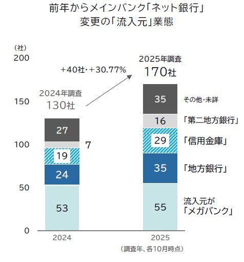 前年(2024年調査)からメインバンクを「ネット銀行」へ変更した170社の動向をみると、「メガバンク」(55社)からの流入が最も多く、「地方銀行」(35社)、「信用金庫」(29社)と続いた。規模は小さいものの、メガバンクや地銀から流入する社数が増加しており、既存の金融機関が牙城としてきた法人分野に「ネット銀行」が攻勢をかける構図が鮮明となった。他方で、「ネット銀行」全体の増加数に比べると流入は少なく、新たに創業した企業などがメインバンクとしてネット銀行を選択する動きが多くみられた。