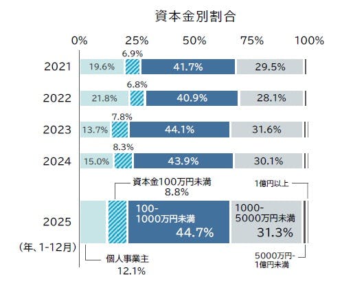 資本金が判明した休廃業・解散企業(個人事業主を含む)をみると、2025年は資本金「100-1000万円未満」が最も多く、44.7%を占めた。前年(43.9%)を0.8pt上回ったほか、コロナ禍前の2019年(44.0%)も上回った。資本金「100万円未満」(8.8%)も年々上昇傾向が続き、2025年は資本金1000万円未満の企業による休廃業・解散が半数を超えた。総じて、2025年の休廃業・解散は、小規模・零細規模の企業を中心に多く発生した1年となった。