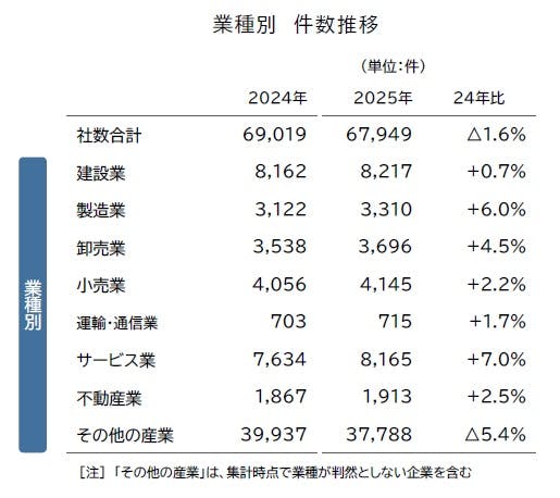 業種別にみると、その他(詳細不明を含む)を除く7業種すべてで前年から増加した。全7業種が前年比増となるのは、2023年・24年に続き3年連続となる。最も件数が多い「建設業」(8217件)は、前年から0.7%増加し、過去10年では2016年(8420件)に次いで多かった。前年からの増加率が最も高いのは「サービス業」(8165件、前年比7.0%増)で、「製造業」(3310件、同6.0%増)が続いた。「運輸・通信業」(715件、同1.7%増)は、トラック輸送などを中心とした運輸業での増加が目立ち、過去10年で最多となった。「製造業」も、2024年(3122件)を上回って過去10年で最多件数だった。