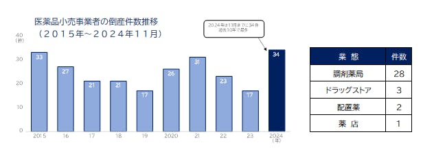 ドラッグストア、薬店、調剤薬局の経営や配置薬事業などを手がける、医薬品小売事業者の2024年の倒産件数は11月までに34件発生した。負債総額は143億9800万円となり、過去10年で最多・最大となった。このままのペースで推移すれば、年間件数は37件前後となる見通し。グループで調剤薬局を経営する「寛一商店」(京都)と関係会社8社が7月、経営不振などを理由に東京地裁へ会社更生法の適用を申請したことで全体の件数を押し上げた。34件の内訳を見ると、業態別では「調剤薬局」が28件で最も多く、「ドラッグストア」(3件)、「配置薬」(2件)、「薬店」(1件)が続いた。また、都道府県別では「東京都」(7件)、「宮城県」「新潟県」(各4件)の順となり、負債額別では1億円未満の小規模倒産が20件を占めた。