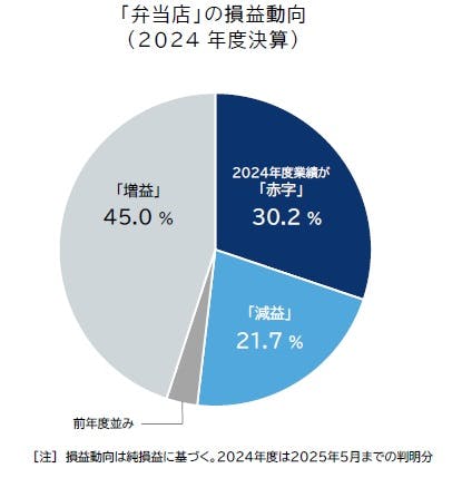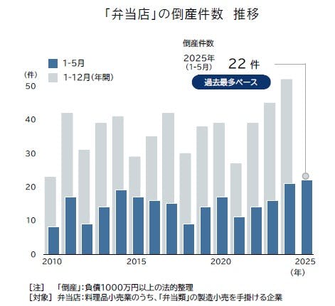2025年1-5月に発生した、仕出しやテイクアウトを中心とした弁当店の倒産件数は22件で、前年同期(21件)を上回るペースで推移した。弁当需要の縮小に加え、近時は特にコメ価格の高騰が経営を圧迫しており、2024年度の弁当店の業績悪化割合は51.9%と半数を占めた。安価な備蓄米が放出されたものの、品質維持のため新米を使いたいという声もあり、採算性確保が課題となっている。