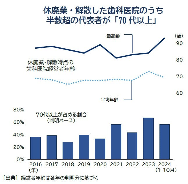 経営者の平均年齢が60歳を超えるなど高齢化が進む歯科業界では、近年は特に歯科医の高齢化が要因とみられる廃業が目立っている。2024年に「休廃業・解散」となった歯科医院の代表者年齢は69.3歳と70歳に迫るほか、最高齢は90歳超と集計可能な2016年以降で最高を更新した。