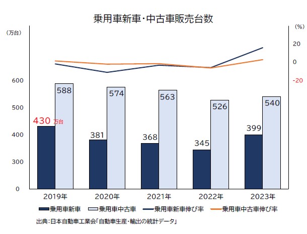 2023 年の普通自動車の販売台数は約 399 万台と前年比 15.7%増、中古自動車の販売 台数は約 540 万台と同 2.6%増となった。 背景としては、半導体不足の解消効果と共に、2023 年秋に開催された「ジャパンモ ビリティショー」を見据え投入された新モ デル効果等も挙げられる。また、新車流通 活発化に伴う中古車登録数増加という効果も表れた。