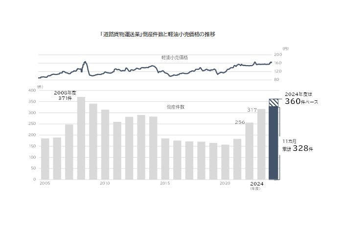「2024年問題」が顕在化し、自動車運転従事者の有効求人倍率(2024年12月)は2.82倍と全業種平均(1.22倍)を大きく上回るなど、道路貨物運送業界での人手不足感が顕著となっている。軽油価格も160円台と高止まり、収益、資金繰りともに厳しい環境が続く。道路貨物運送業の倒産件数は2024年度(11カ月累計)で328件となり、すでに前年度(317件)を超えた。通年ではリーマン・ショック時(2008年度)の371件に迫る、過去2番目の高水準となりそうだ。