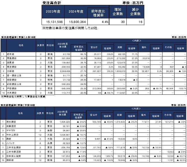 主要上場建設会社58社のうち、単体の受注高が判明した46社の2024年度の受注高合計は、前年度比4.4%増の15兆8003億6400万円だった。