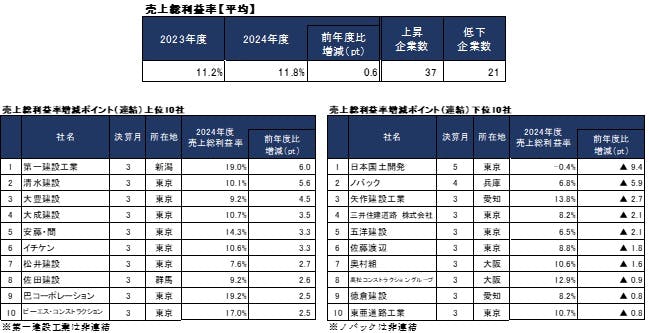 主要上場建設会社58社の売上総利益率(連結ベース)の平均は、2024年度は11.8%。前年度より0.6ポイント改善となった。