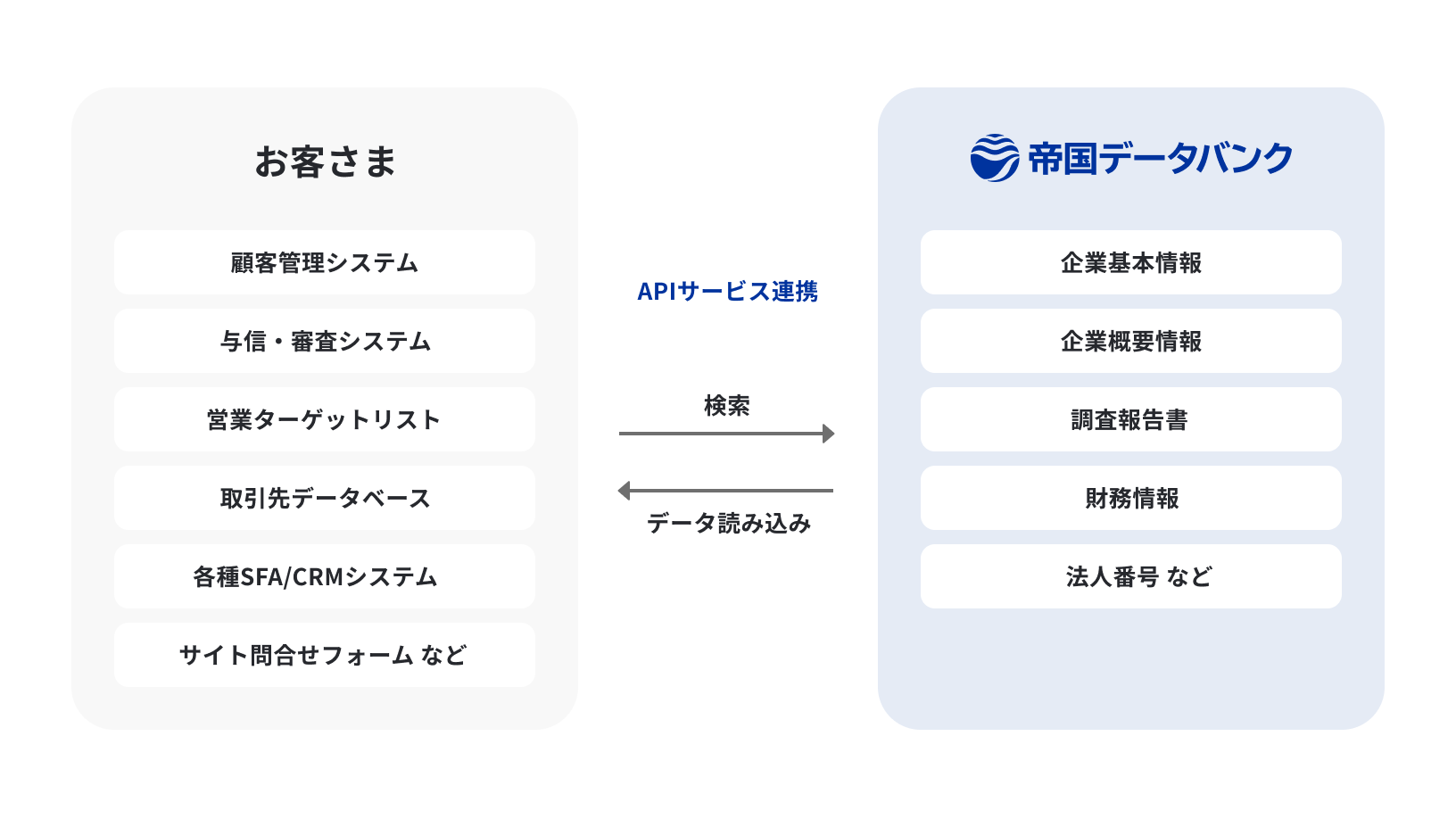システム連携により、お客さまのシステムから直接、全国全業種の企業情報が収録された帝国データバンクのデータベースにアクセスし、リアルタイムに情報検索、取得できることで、効率的な情報収集と常に最新の情報に保つことができます。