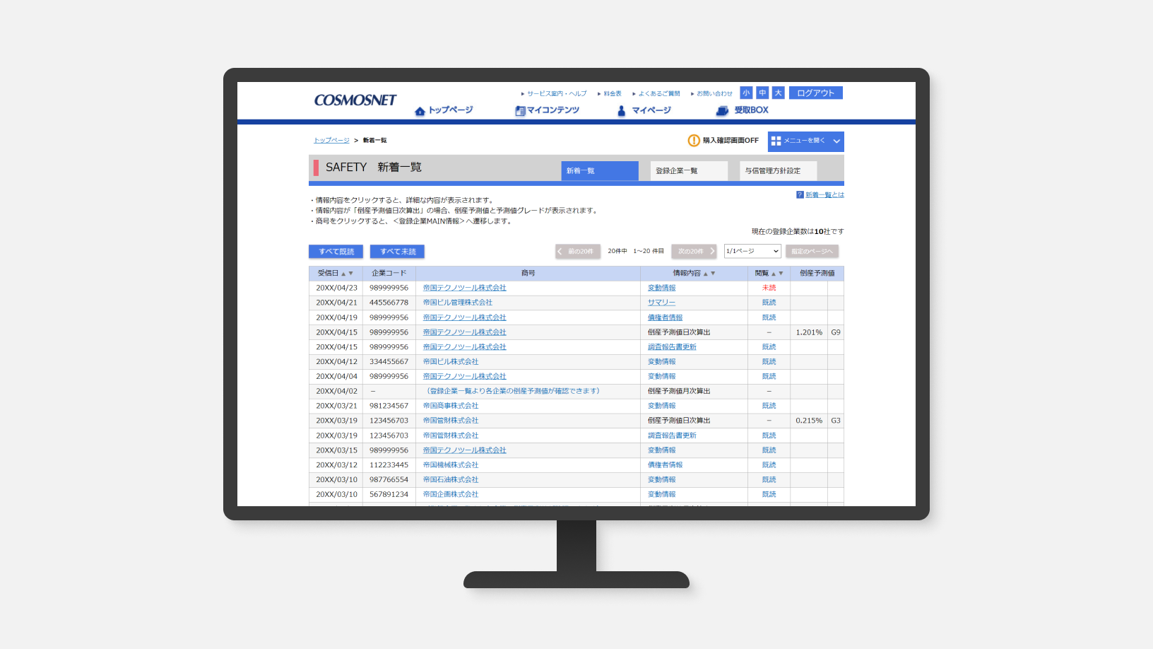 登録企業の調査報告書の更新や変動情報の入手を、タイムリーにE-mailでお知らせします。メールを受信したら、COSMOSNETにログインして、登録企業の最新情報を確認してください。COSMOSNETの画面で、登録企業を一覧で確認でき、お届けした情報は登録期間中最大で5年間保存されるので効率的に情報を管理しておくことができます。