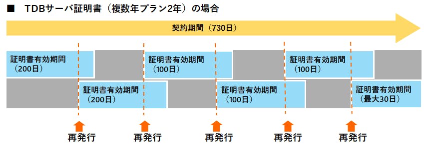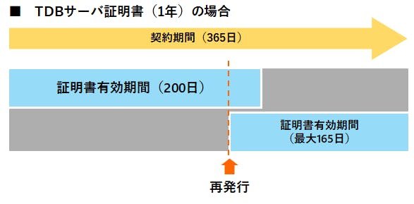 TDBサーバ証明書は年間契約になります。その契約期間内であれば何度でも再発行が可能であり、本ルール適用による契約期間や価格の変更はありません。