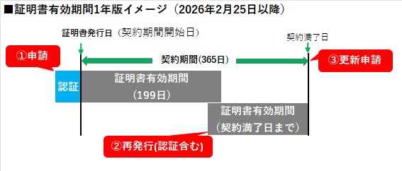 ※更新の場合は、残存期間+証明書の有効期間となりますが、有効期間の上限は199日です。