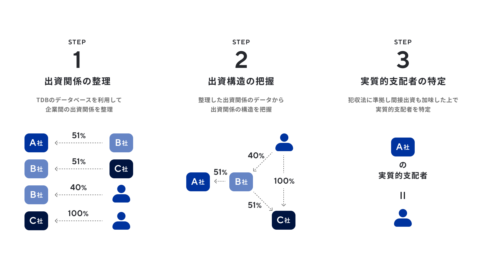 • 犯収法に準拠したTDBの独自アルゴリズムにより、実質的支配者を特定することが可能