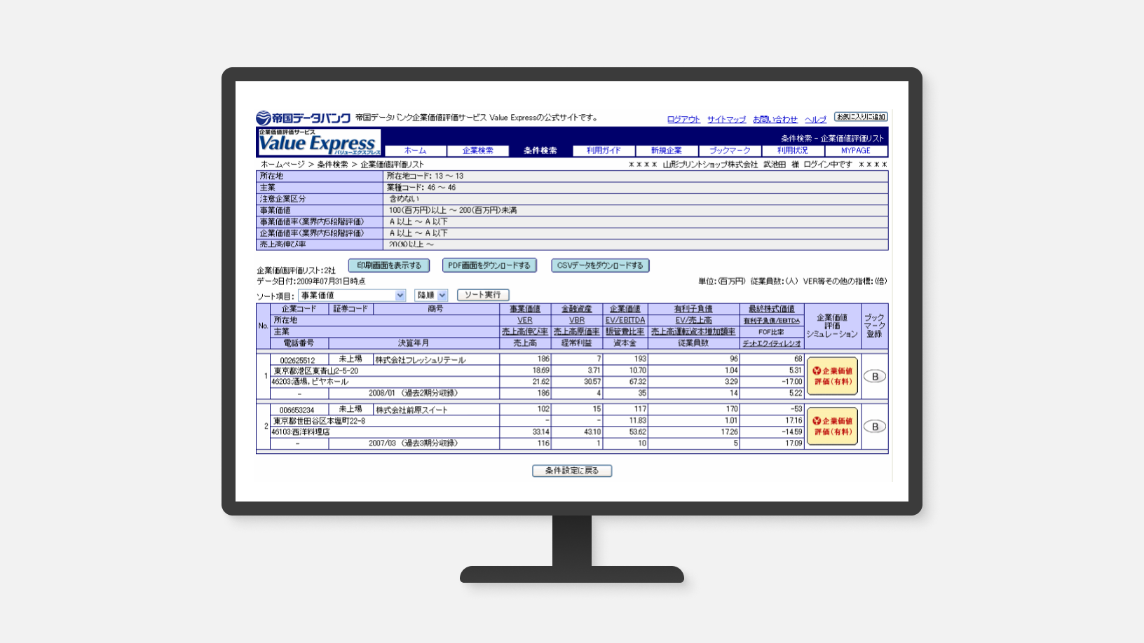 企業分析を行うときの関心事のひとつが将来予測です。Value Expressは、帝国データバンクの企業財務データベースに基づき企業価値を算出して、お手元でシミュレーションできるインターネットサービスです。